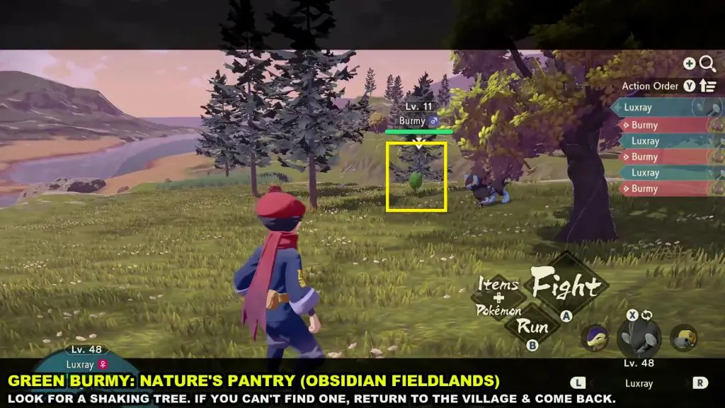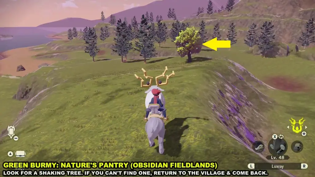 Green Burmy will drop from shaking trees in the Nature’s pantry of Obsidian Fieldlands as shown in the picture below. Throw a Pokeball containing a Pokemon on the shaking tree and there is a chance that a Green Burmy Will fall from the tree. Catch the Green Burmy.