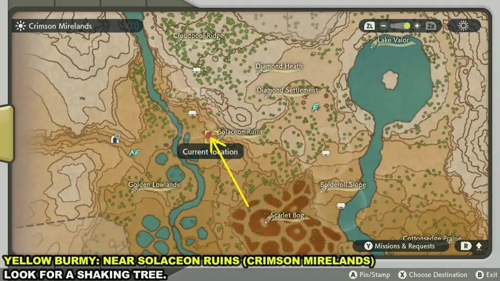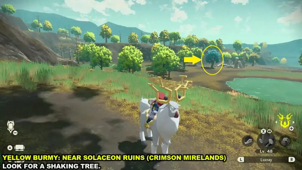 Yellow Burmy will drop from shaking trees in the Solaceon Ruins of Crimson Mirelands as shown in the picture below. Throw a Pokeball containing a Pokemon on the shaking tree and there is a chance that a Yellow Burmy Will fall from the tree. Catch the Yellow Burmy.