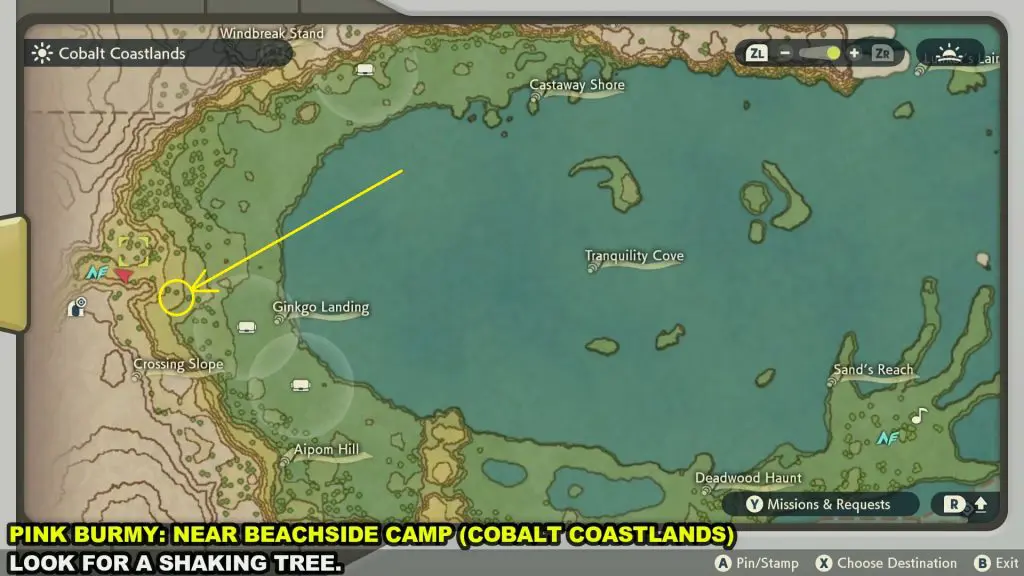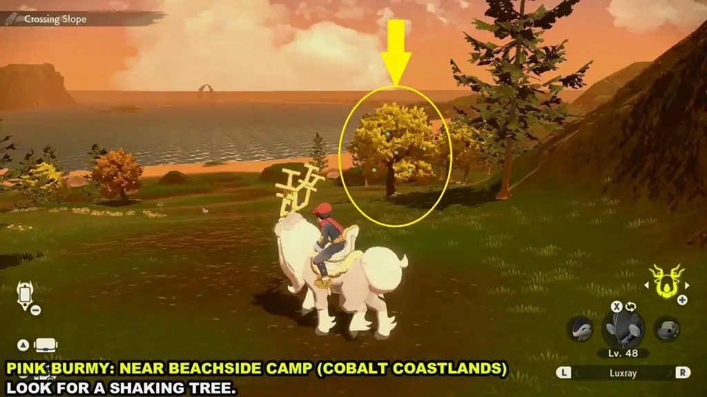 Pink Burmy will drop from shaking trees near the Beachside Camp of Cobalt Coastlands as shown in the picture below. Throw a Pokeball containing a Pokemon on the shaking tree and there is a chance that a Pink Burmy Will fall from the tree. Catch the Pink Burmy.