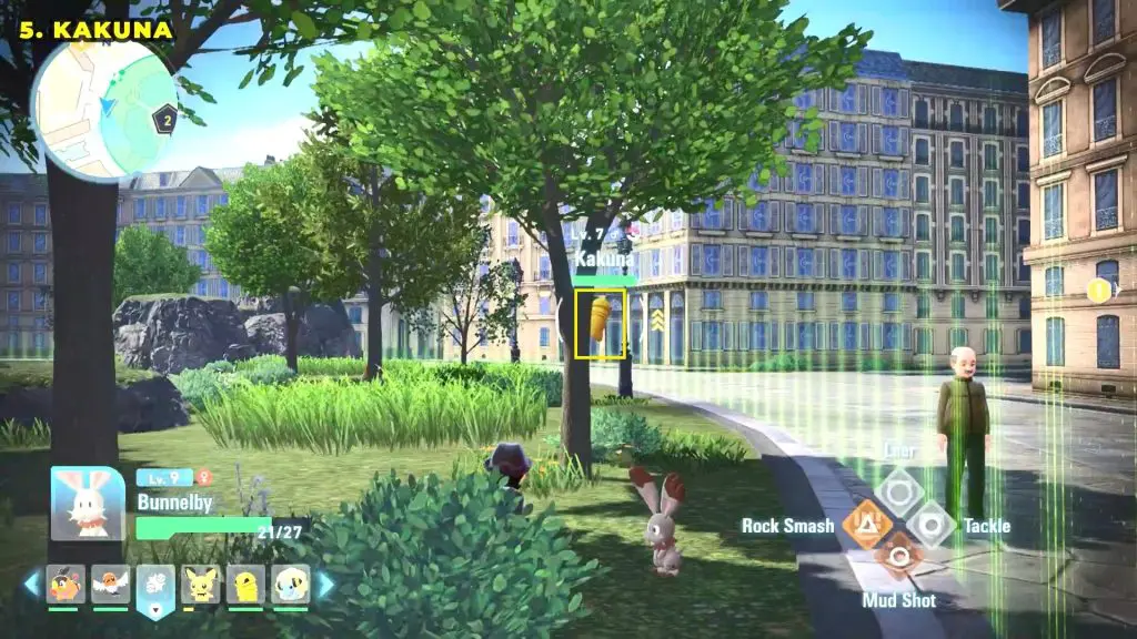 Kakuna is a Bug/Poison Type Pokemon that appears in Pokemon Legends: Z-A. It can be found on the tree in the northwestern part of Area 2.