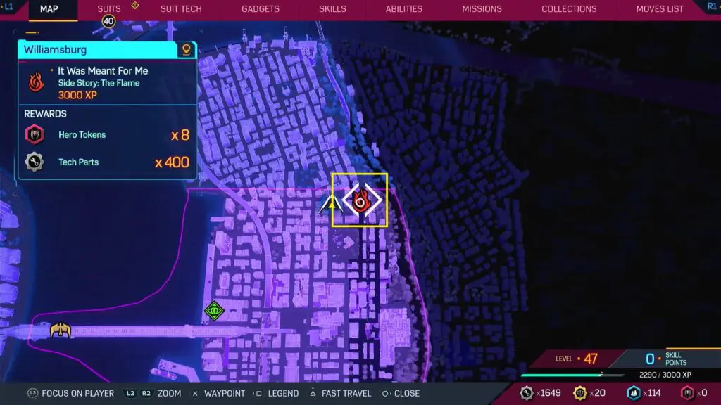 These are short side quests for Peter to complete. The first Flame quests become available after finishing Main Quest 06: Amends. Once you finish one quest, it unlocks the next one in The Flame Mission series. “It Was Meant For Me” serves as the fourth and ultimate Flame Mission, meaning you should complete the other three first before you can tackle this final mission in Williamsburg.