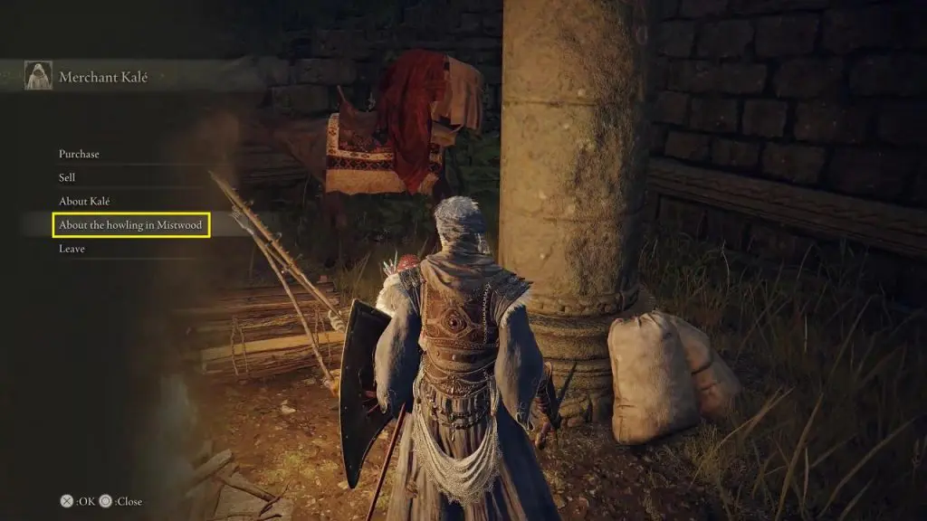 Now you will get the option to ask Merchant Kale about howling in the Mistwood. He will give you the Finger Snap sign, and tell you to use this sign next tie you hear the howling.