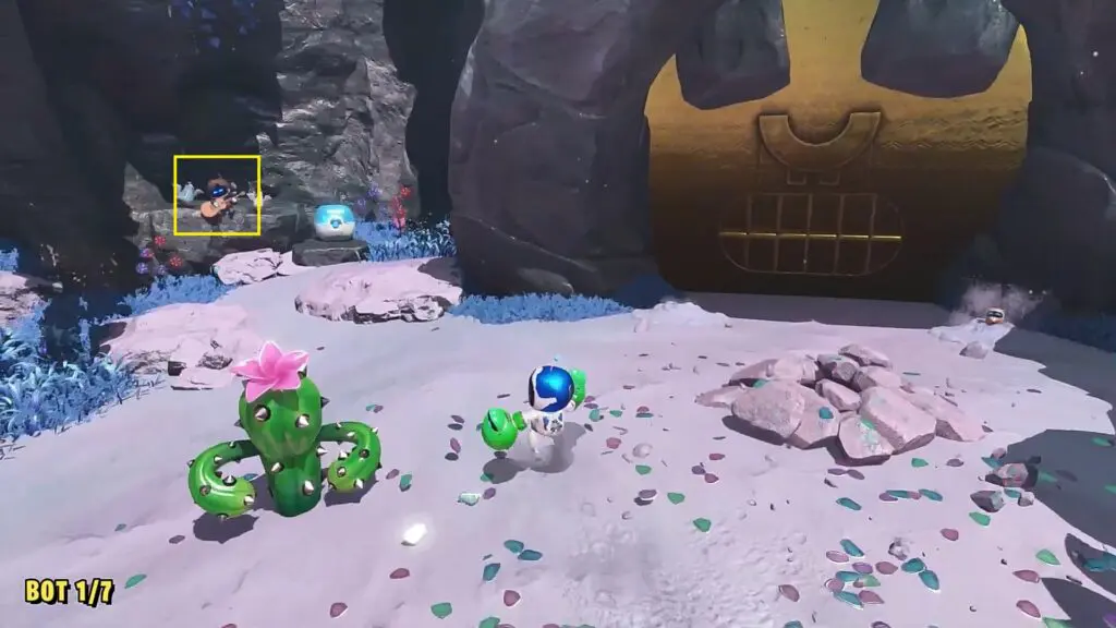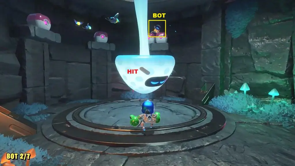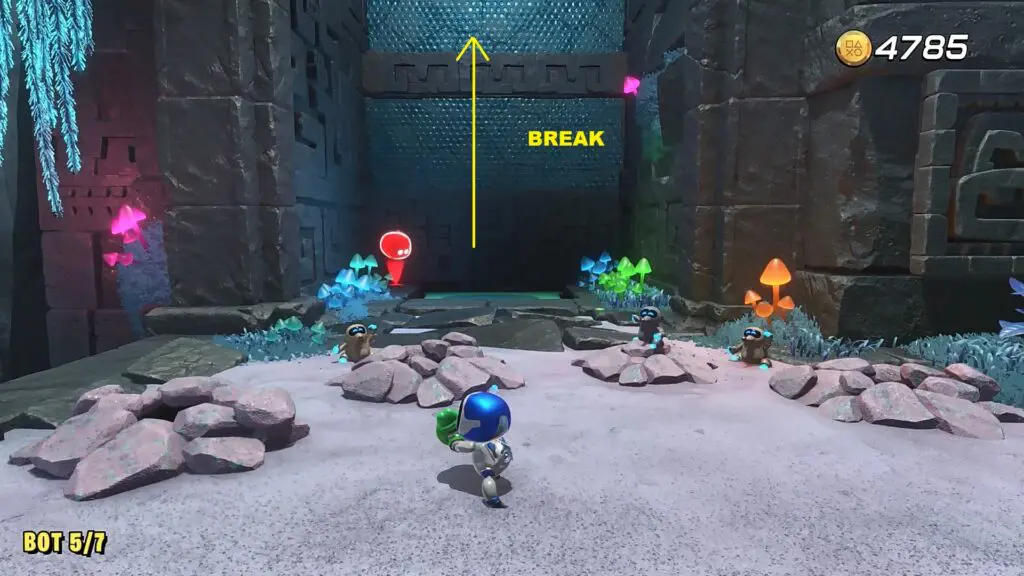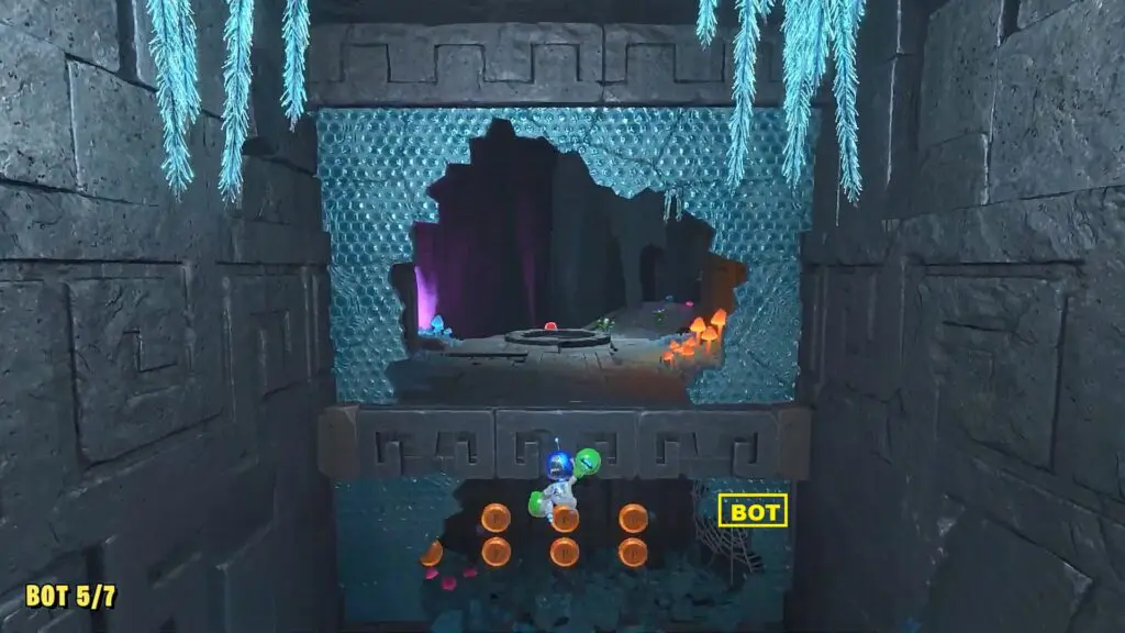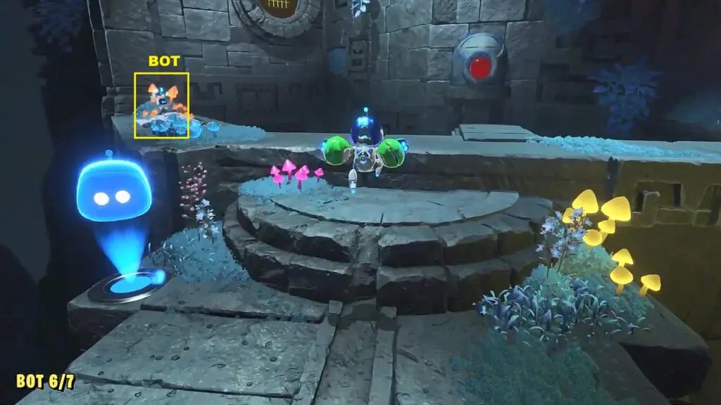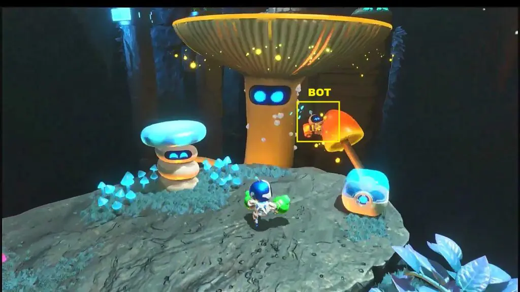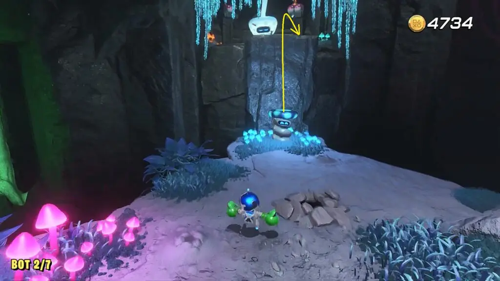 Proceed ahead and as you reach the next platform, instead of going straight, enter the small cave on the left side as shown in the picture below. There you will see the bot sitting on top as shown in the second picture below. Hit the inverted mushroom so that it hits the bot and makes it fall. Now rescue the bot.