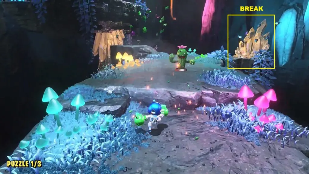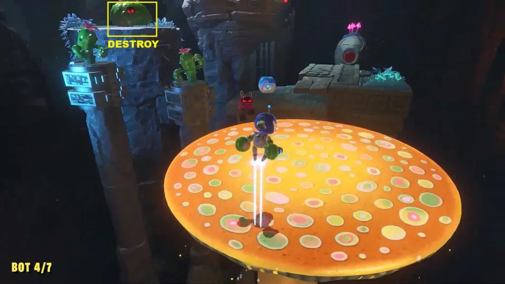 Climb up the yellow mushroom. Then go left and destroy the large cactus as shown in the picture below to rescue the bot.
