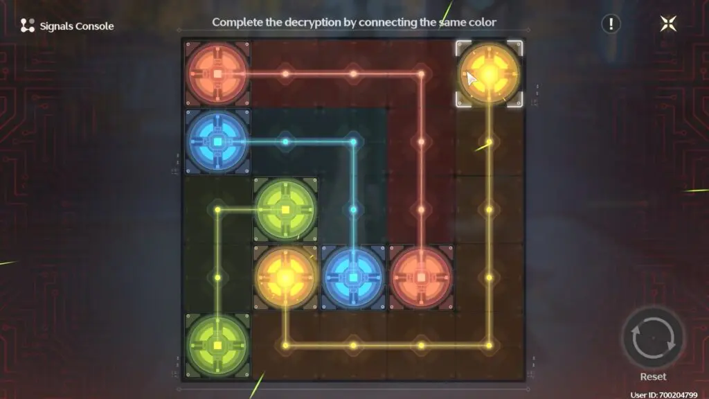 Interact with the hub to start the test. The player needs to connect the red bulbs with other red bulbs, the blue bulbs with other blue bulbs, and the yellow bulbs with other yellow bulbs. It is crucial to ensure that the paths do not overlap. Refer to the image below for the solution.