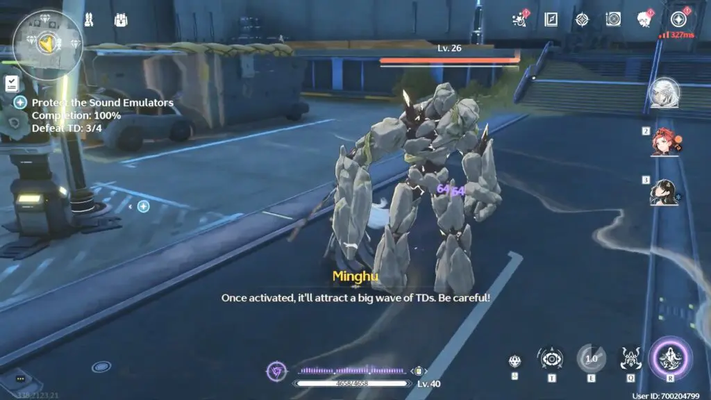 Fight with the enemies that spawn in the area to protect the Sound Emulators.
