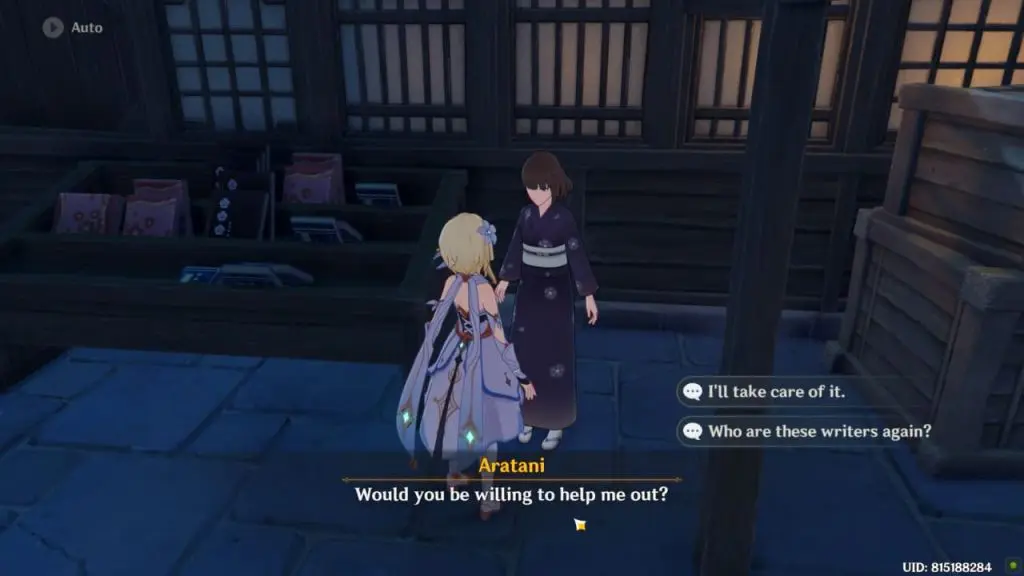 To begin this quest, you will first need to have completed the Ritou Escape Plan and the Bookworm Swordsman quests. Start this quest by talking to Aratani, who can be found next to the Kiminami restaurant in Inazuma City. Speak with her to receive the quest. Aratani who is an editor at the Yae Publishing House needs travelers’ help.