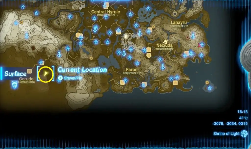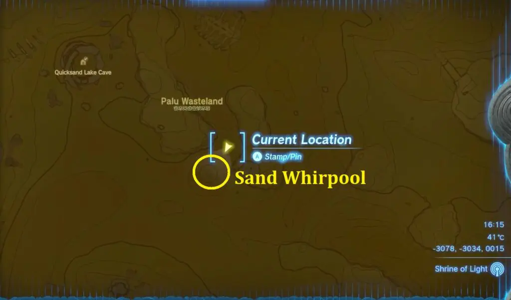 Chichim Shrine is in the Gerudo Desert region of Hyrule, underneath the Palu Wasteland, east of Gerudo Town. It’s located inside the underground Ancient Prison Ruins, which are accessed via a whirlpool of quicksand south of the Palu Wasteland. Jump into the quicksand and sink to enter the ruins.