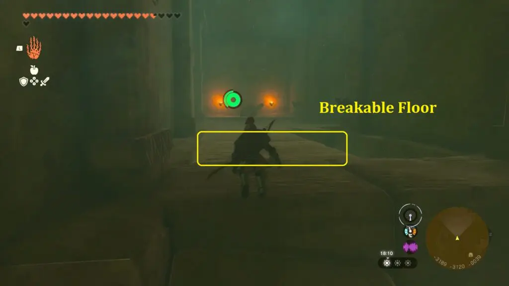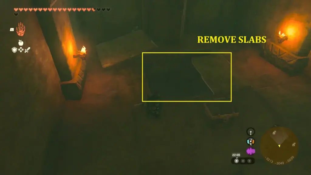 observe the area behind the chest, you will come across a pair of stone slabs positioned on the floor. Utilize the Ultrahand to shift them away, exposing a lever in the ground.