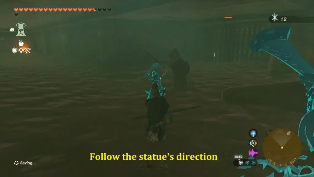 Turn left and eliminate any Gibdos that you may come across by employing fire-based attacks. Continue following the corridor as it curves to the right. Take note of the sword-wielding statue pointing in the right direction. Follow the statue’s direction and turn right under the partially open gate.