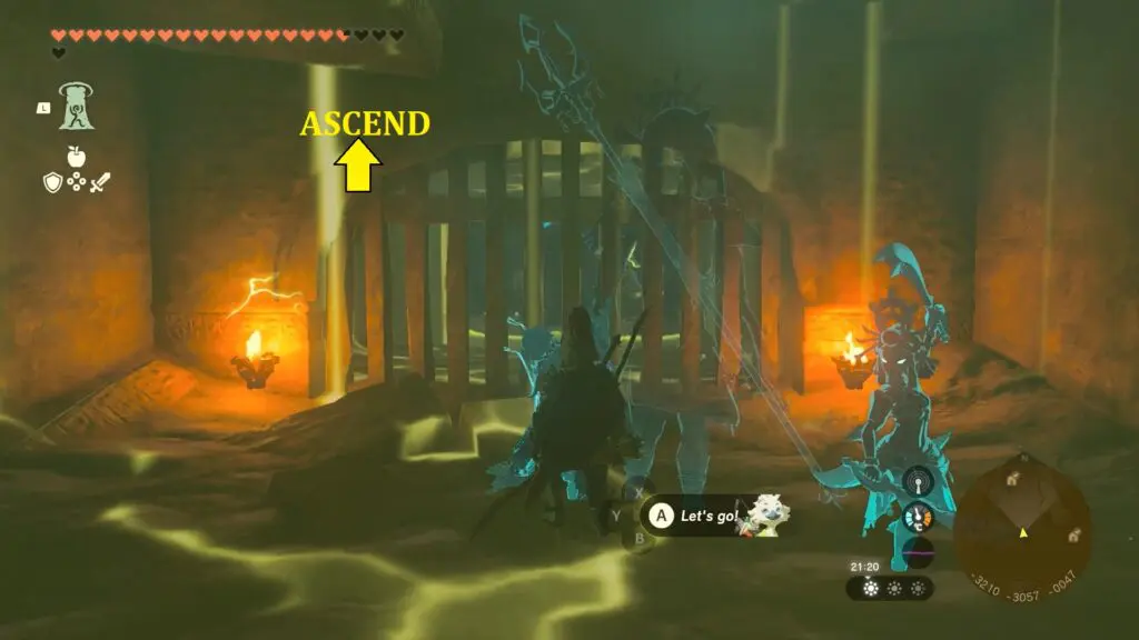 At the end of the corridor, you will catch a glimpse of the shrine behind a gated entrance. Utilize Ascend to reach the chamber above, and open the chest to obtain a Gerudo Scimitar.