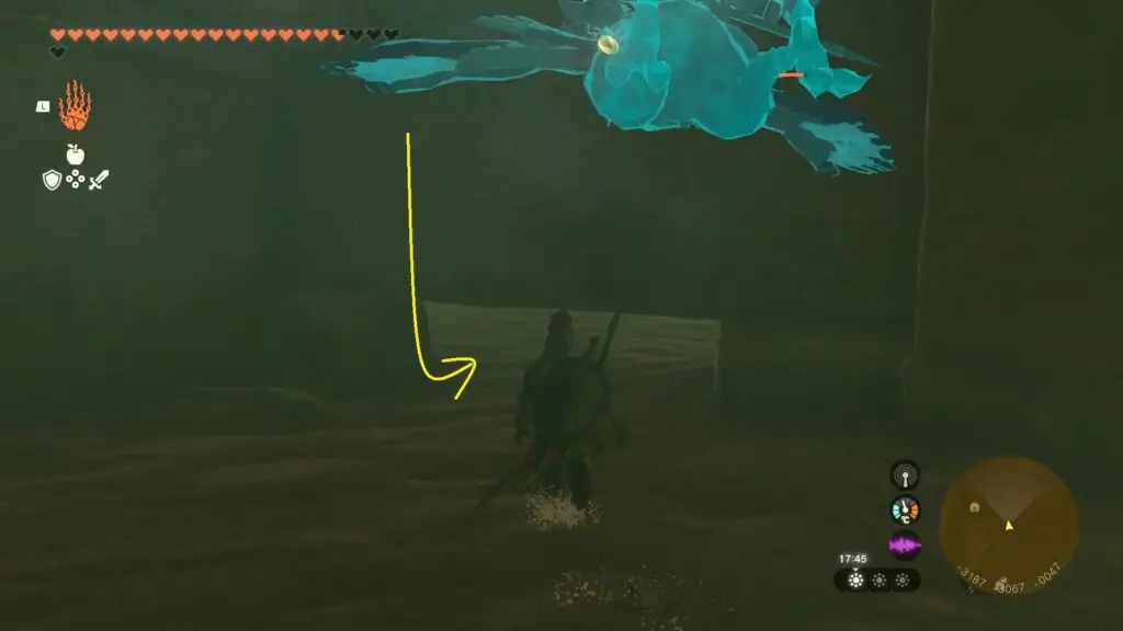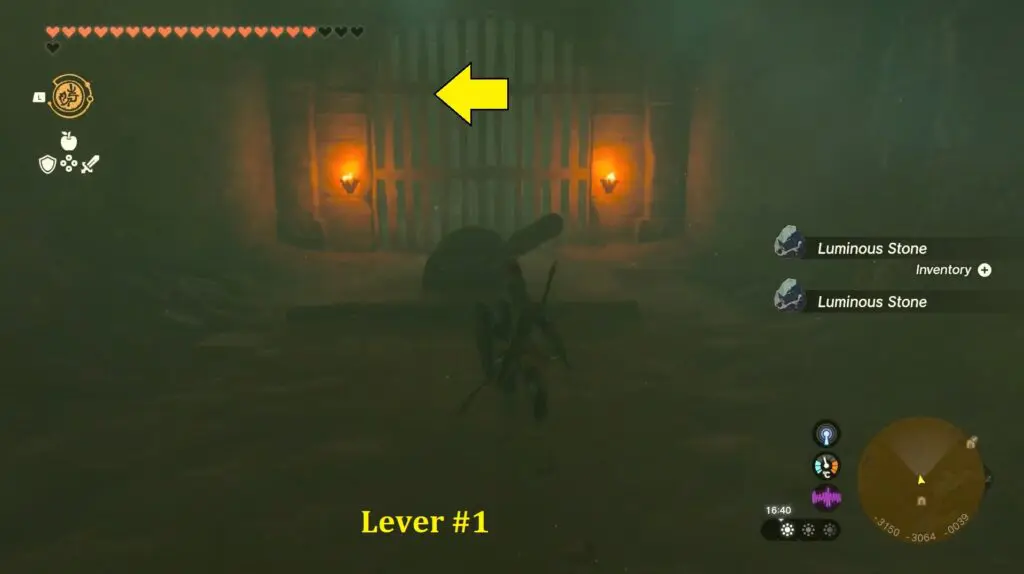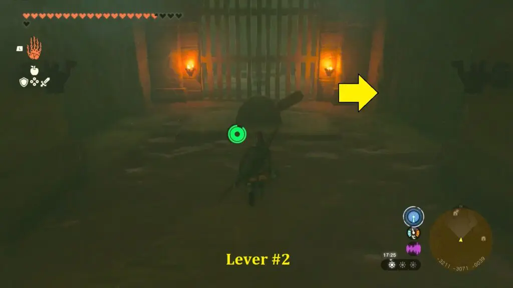 Once your feet land on the ground, proceed straight ahead through the corridor and utilize the Ultrahand to activate the big lever at the end to unlock the gate.