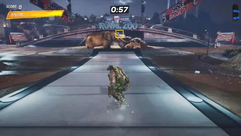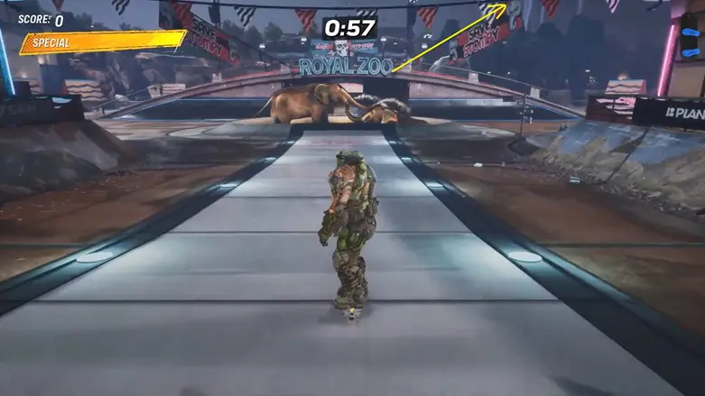 From the starting point, head left of the elephant statue and follow the uphill path by sticking to the left side. (Don’t go all the way to the far left end of the Zoo.) Use a wallride to get onto the roof of the raised platform at the end.