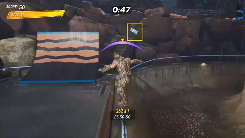 From the starting point, go to the right of the elephant statue. Skate past the large quarter pipe to reach the clock tower. On the left side, you’ll see the cash floating above a tree.