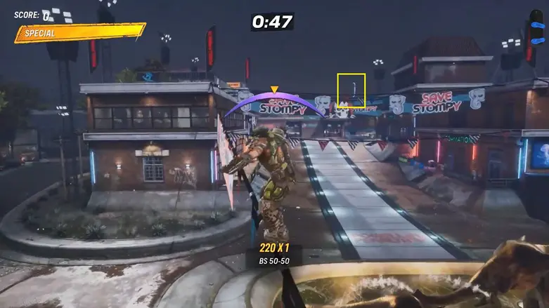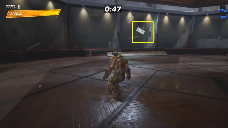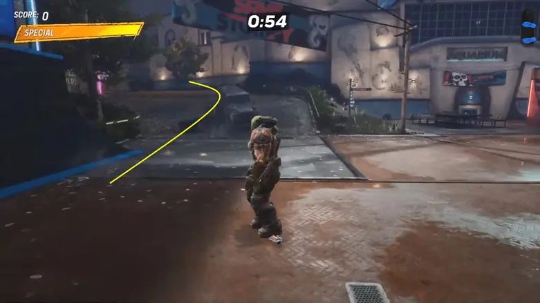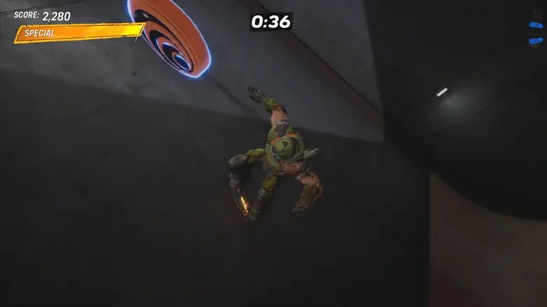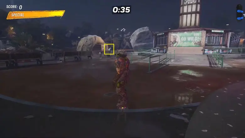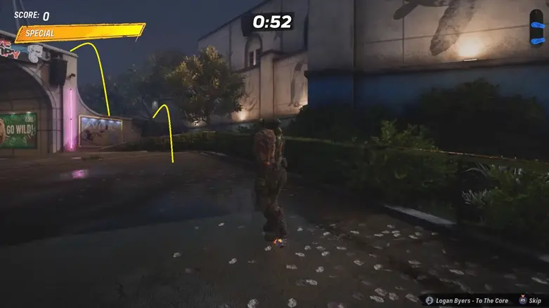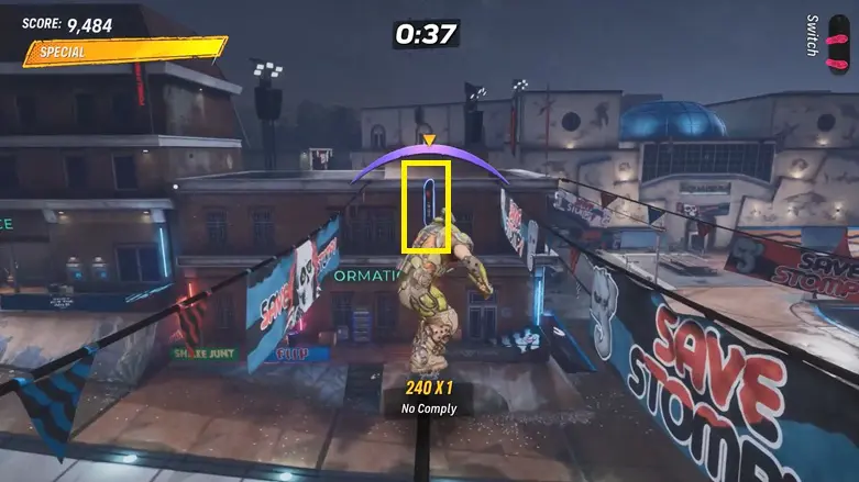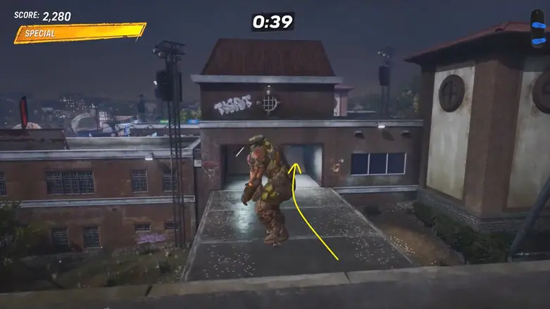 Once you’re up on the rooftop, make your way to the other side of the platform. You’ll find a quarter pipe going into the building. Use it to launch into the air to grab the logo floating above.